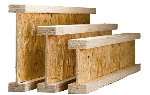 Poutre en I pour toitures et planchers qui se compose d’une bride supérieure et inférieure en LVL avec un panneau d’âme en OSB