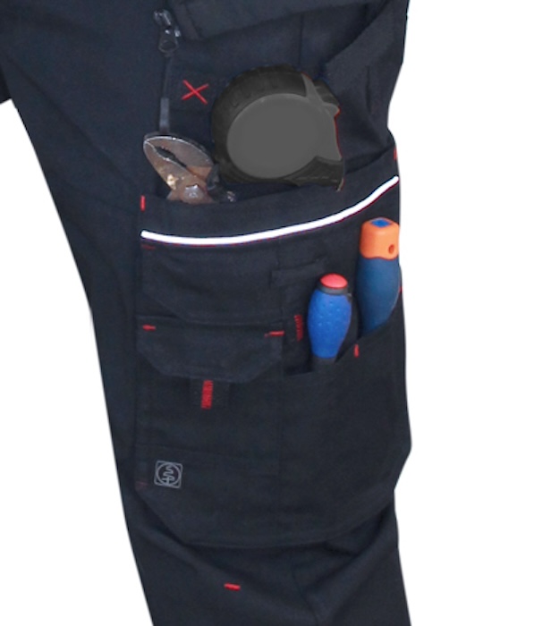 autoagrippant + 1 grande poche à rabat + emplacements outils – Dos : 2 grandes poches à soufflet, dont 1 avec rabat – 1 porte marteau – Double et triple piqûre – Points d’arrêt contrastants