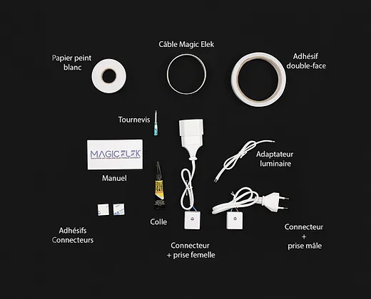 Inclus dans chaque pack : 1 x Câble ultraplat Magic Elek , 2 x Connecteurs qui servent d’adapteurs, 1 x prise mâle, une prise femelle et un câble dénudé , adhésifs double-face pour coller le câble, 1 x pot de colle pour coller sur les surfaces irrégulières, 1 x adhésif papier peint blanc, 1 x tournevis, 1 x manuel d’utilisation avec illustration.